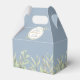 Une boîte de bienvenue de mariage douce et débutant avec des feuilles délicats d'aquarelle sur un arrière - plan bleu poussiéreux encadrant vos noms et message de remerciement. Une façon parfaite de remercier vos invités ! Conçu par Thisisnotme©