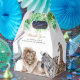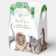 Wild zoo merci les boîtes de faveur de la fête avec de mignons animaux de safari aquarelle (girafe, éléphant, lion, zèbre, léopard, singe, abeille), des feuilles de palmiers, et un modèle de remerciement qui est facile à customiser.