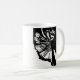 White ceramic mug featuring the artwork of Jon Ott, depicting a couple of ballroom dancing partners as they sway elegantly across the floor in fine evening wear. The original artwork was done using black and white paint markers.