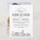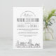 It features a modern deco-style illustration of the city's skyline resting towards the bottom. Centred above this are the names of the wedding couple and your wedding day information in matching open-lined style text. This is all together presented in a neutral black and white, classic colour theme.