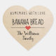 Modern "homemade with love" heart sticker featuring "banana bread" with a black font on a rustic kraft background embellished by a cute red heart. Customize text.