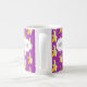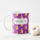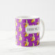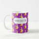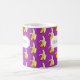 Are you bananas about coffee? A mug featuring the caption "BANANAS ABOUT COFFEE" over a lively pattern of stylized pixel art yellow bananas on a vivid purple background.