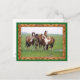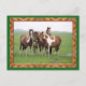 A group five Appaloosa brown and white horses standing together in a green field.With a baby colt.This postcard has a wood floor brown frame and the forest green background. The background colour can be change to any colour you want it to be with the custom tag.This postcard you can add text at the same time..