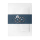 Envelopper toute la suite mariage de cercles modernes d'invitation pièces dans cette jolie bande de ventre bleu marine profond avec un monogramme original personnalisé niché dans une paire de bagues mariages en or rose faux brillant.