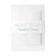 Cette bande de ventre est conçue pour tenir votre invitation et les enceintes ensemble. Présente une fausse feuille argentée fleurit sur un arrière - plan blanc. Le nom du couple apparaît en lettres turquoises ou turquoise élégantes.