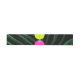 Arcs jaune néon et rose sur l'arrière - plan en feuilles de palmier foncé avec monogramme en haut et palmier d'art en ligne blanche.