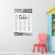 Background image of old wood. Keep track of table assignments--insert names by table, or alphabetically. Room for 100 names. Use "customize" option if you need to change spacing.  NOTE:  When you insert your names, they will not line up evenly (because of differences in name length). To align them, click the customize button. You will see a list on the right. Hold down the ctrl key while clicking each name in the group you wish to align. Once they are all selected, click Arrange. Then click Align Selected. Then choose the image labelled "left." This will give your selected group a straight left-side alignment. While the names are still selected, you can then drag and drop the box on the design page if you want to move the whole block of names.