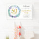 Cette bannière pour la célébration du 50e anniversaire du mariage présente une délicate couronne de verdure fleurie faite de bleuets, de plantes et de fleurs lilas. La bannière peut être facilement personnalisée avec vos informations spéciales d'anniversaire d'or dans un texte élégant. Les fournitures et la papeterie de la fête correspondante sont disponibles dans la collection "50e anniversaire de Mariage Bluebells Floral Wreath".