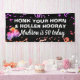 Funny Happy 50th Birthday Honk Your Horn Name BannerConçu avec personnalisable noir arrière - plan et festive ballons arc-en-ciel coloré et faux parties scintillant confetti arrière - plan sur noir. Drôle phrase "Honk Your Horn Holler and Wave" suivie par le nom customisé et "is 50 today" dans gros caractères blancs en gras.