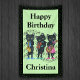 Cette bannière en tissu est vert clair avec une bordure noire avec des pois vert foncé et trois musiciens de chats noirs qui jouent de la guitare, du saxophone et du violon avec des barres de notes musicales. Customisez le texte de Joyeux Anniversaire et votre nom avec les modèles.