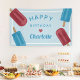 Conçu pour correspondre aux invitations à la fête d'anniversaire de nos enfants célèbres, cette jolie bannière personnalisée présente des popsicles rouges et bleus avec les mots "Joyeux anniversaire [Nom]" dans le centre en lettres rétro, orné d'un coeur.