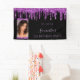 Une bannière pour une fête d'anniversaire de 21ème anniversaire, jeune fille et glamour (ou tout âge). Un arrière - plan noir chic avec des gouttes de parties scintillant violet tendance, la peinture goutte à goutte. Personnalisez et ajoutez votre propre photo verticale de la fille d'anniversaire. Le nom est écrit dans un script de style moderne écrit à la main. Lettres violettes légères.