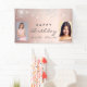 Une bannière pour une fête d'anniversaire girly et glamour pour deux filles, des femmes. Un arrière - plan métallique à l'apparence rose à la fausse poussière de parties scintillant argentée. Ajoutez vos propres 2 photos des filles d'anniversaire. Texte : Joyeux anniversaire. Le mot Anniversaire et les noms sont écrits avec un script de style à la main moderne. Peut être utilisé comme bannière de bienvenue et comme décoration murale de fête.