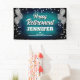 Fun banner sign for indoors or out, featuring festive silver metallic balloons on both sides of the design with sparkly, silver metallic confetti on a rich textured aqua blue background for your personalized retirement party banner.