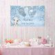 Pour un Baby shower élégant. Un arrière - plan faux métallique bleu clair. Décoré avec des gouttes de parties scintillant imitation, le look goutte à goutte de peinture, la poussière de parties scintillant, ballons bleus et argentés et un éléphant bébé. Personnalisez et ajoutez le nom. Idéal à la fois comme bannière de bienvenue ou comme décor de fête.
