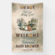 Les animaux se sont rassemblés dans cette forêt boisée rustique aquarelle pour votre "Oh garçon" "We Can Bearly Wait!" ours baby shower célébration "Welcome" signe. Un ours brun se trouve au pied de la forêt au bord du lac et le garder compagnie est un petit raton laveur mignon et dans l'arrière - plan sous un arbre est un renne de repos faon. Conception composite par Holiday Hearts Designs.