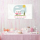 baby shower à thème aventure avec illustration d'une remorque de campeurs roses vintage avec étoffe de vêtements pour bébé et arbre à feuillage persistant. Le texte dit : "L'aventure commence"