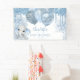 Pour un Baby shower élégant. Un arrière - plan blanc chic. Décoré avec des gouttes de parties scintillant imitation, le look goutte à goutte de peinture, la poussière de parties scintillant, ballons bleus et argentés et un éléphant bébé. Personnalisez et ajoutez le nom. Idéal à la fois comme bannière de bienvenue ou comme décor de fête.