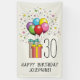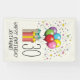 Design à thème d'anniversaire avec des ballons d'anniversaire colorés et deux boîtes de cadeau enveloppées de jolies arcs. Le design est encadré de confettis gais faits d'étoiles et de points. Les couleurs sont le rouge, le rose, le bleu, le jaune, le violet, le turquoise et le beige. Il y a aussi deux zones de texte personnalisables où l'une est destinée à l'âge de la personne et l'autre est destinée au texte personnalisé.