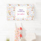 Bandeau d'anniversaire avec un motif mignon et fantaisiste. Ballons à air chaud et nuages mignons avec des visages parmi les étoiles, les coeurs et les ballons. Des couleurs pastel douces composent cet adorable design. Un carré blanc superposé avec votre texte à l'intérieur.