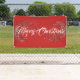 Cette bannière de vacances est présentée dans le style extérieur avec des grommets. Choisissez à l'intérieur ou à l'extérieur, avec ou sans grommets. Montré en rouge avec blanc "Joyeux Noël" script fantaisie avec deux tourbillons d'étoiles en argent à chaque extrémité. Customisez ou achetez comme prévu.
