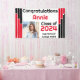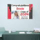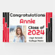Hang this Red & Black Bars One Photo Graduation Banner pour célébrer votre diplômé. Personnalisez avec le nom de votre élève, l'année de classe, le nom de l'école et la photo préférée. Il présente des couleurs rouges et noires pour montrer votre esprit scolaire.
