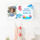 Bannière de fête d'anniversaire pour les animaux de mer des dauphins mignons. Joli dauphins souriants dans le style dessin animé. La photo est dans le cadre de la brosse. Ajoutez votre photo et customisez le texte sur la bannière. Bannière d'anniversaire amusante et mignonne pour une fête de fille ou de garçon.