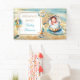 Bannière personnalisée du Baby shower de garçon. Baby shower de mer bleu et marron pastel doux. Un petit garçon dormant à l'intérieur pendant un moment et coquillage doré. Jolie eau bleue de l'océan avec un hippocampe, étoiles de mer et dollar de sable.