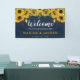 Une élégante bannière mariage d'accueil avec un arrière - plan bleu marine branché, des fleurs de tournesol jaune d'été rustiques, un feuillage vert foncé avec des confettis en feuille d'or. La modèle moderne est très facile à personnaliser. La papeterie mariage correspondante est dans notre collection 'Sunflower de minuit'.