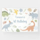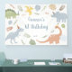 Banderole d'anniversaire de dinosaures mignonne avec des dinosaures dessinés à la main, des ballons et des feuilles tropicaux dans des couleurs pastel douces de vert, bleu, pêche et jaune. Un design ludique et neutre pour un 2ème anniversaire ou une soirée dino. Moderne, capricieux et facile à personnaliser.