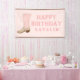 Cette bannière d'anniversaire à thème de cowgirl présente une grosse botte rose sur la gauche avec les mots "heureux anniversaire" sur la droite. Vous pouvez personnaliser avec un nom.
