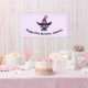 Banderole d'anniversaire avec une amusante illustration thématique Halloween pour les amoureux de les chats. Un gros chat noir aux yeux vêtu d'un grand casquette de sorcière noire avec une ceinture rose violet autour du bord.