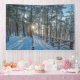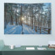 Vue sur la pinède enneigée avec des rayons du soleil et chemin en bois pour une promenade relaxante. Couvert de pins, de sapins et d'épinettes.