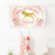 Soirée de cheval rose et or trottant cheval or avec fleurs roses et arrière - plan rose bannière personnalisée comme toile de fond pour votre fête mise en place pour chevaux, selle up, rodéo, fête d'anniversaire de cowgirl.
