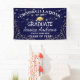Une bannière design "Félicitations à notre diplômé", avec un arrière - plan bleu marine qui peut être changée en n'importe quelle couleur, des lumières scintillantes à cordes, des coins parties scintillant dorées, un capuchon de graduation en or et un texte qui peut être facilement customisé.
