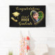 Créez une bannière unique de graduation en noir et or pour la classe de 2025 diplômée avec une photo en forme de coeur, Félicitations dire, et les illustrations de casquette et de diplôme de la grad. S'il vous plaît personnaliser avec le nom et le nom de famille du diplômé, télécharger une photo personnalisée par modèle, et changer un an avant de commander. Vous pouvez également modifier la couleur de l'arrière - plan à l'intérieur de l'outil de conception pour qu'elle corresponde aux couleurs de votre école.