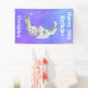 Cette bannière en tissu a un croissant blanc avec un joli visage et décoré de formes abstraites colorées en violet, jaune et bleu sur un mélange de violets et de bleus arrière - plan. Customisez votre texte avec les modèles.
