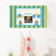 Bannière de fête d'anniversaire du mignon garçon, rayures orange et bleues et photo de votre bébé garçon. Il suffit de changer l'image, le nom et l'âge dans la zone de personnalisation.