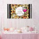Une bannière pour une fête de bachelorette. Un léopard tache motif pour un arrière - plan. Un verre à vin à l'allure cool, surmonté d'une épaisse encre noire. Le vin à l'intérieur du verre est rose chaud. Couleurs vives et vives. Personnalisez avec vos infos de bachelorette sur un cercle blanc dessiné à la main. Dernier fling avant l'anneau écrit dans une police cool tendance.
