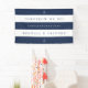 Bienvenue invités à votre dîner de répétition nautique, d'été ou de la côte avec cette bannière rayée bleu marine et blanc étincelante. Personnalisez avec trois lignes de texte personnalisé accentuées par deux illustrations d'ancre blanche. Montré avec "demain nous le faisons ! Félicitations [nom] et [nom]."