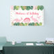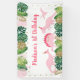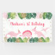 Cette adorable bannière d'anniversaire présente des feuilles d'aquarelle tropicale ornés d'ornements en parties scintillant dorée et de dinosaures roses.
