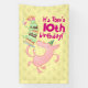 Un joyeux cochon sur une bannière d'anniversaire. Utilisez "Personnalisez ce modèle" et modifiez le nom et l'âge, en créant un élément unique et customisé. Une bannière avec un cochon brillant, sous un gâteau de couche de teetering avec des éclats de glace verte et surmonté de bougies roses.