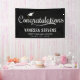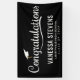 Bannière moderne de graduation avec lettrage blanc gras avec un arrière - plan noir. Le design comporte un bouchon blanc de graduation avec l'expression "Félicitations". Personnalisez la bannière de graduation de la Marine en ajoutant le nom du diplômé, le nom de l'école et l'année de graduation. Pour un look plus personnalisé, changez l'arrière - plan en couleurs de votre école. L'affiche de fin d'études est parfaite pour votre fête de fin d'études secondaires ou collégiales !