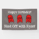 Cette adorable conception de fêtes d'anniversaire de fêtes de fusées rouges présente l'oeuvre dessinée à la main de WindyDesign et les mots "Joyeux anniversaire, Blast off with......" sur un arrière - plan gris.