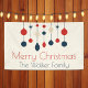 Bannière de fête de Noël joyeux rétro avec des ornements de style 70 vintages en rouge, bleu et ivoire au-dessus de votre nom de famille. Beau décor de vacances nostalgique pour vos dîners.