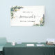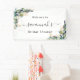 Pour une Fête des mariées moderne et élégante. Un arrière - plan blanc chic. Décoré de feuilles d'eucalyptus couleur verte, de sprigs, de verdure et d'un faux feuille d'or. Personnalisez et ajoutez un nom. Avec le texte : Bienvenue à et Fête des mariées. Peut être utilisé comme bannière de bienvenue ou comme décoration murale de fête. Le nom est écrit avec un script de style à la main tendance avec des swashes. Pour que les swashes ne suppriment que le nom de l'échantillon, laissez les espaces ou émoticônes devant et après le nom.