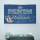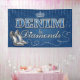 Bannière de fête en denim et diamants, toile de fond. Thème fête d'anniversaire, jeans, denim, diamants, talons hauts, diadème, couronne