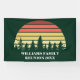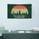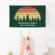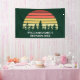 Banderole de la fête de la famille cool en vert pour tout le groupe sur une sortie nature ou un voyage de camping. Ce décor personnalisé présente un beau coucher de soleil vintage sur une forêt de jolis arbres sous votre texte personnalisé.