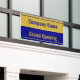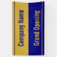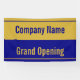 Une grande bannière d'ouverture fait savoir à tout le monde que votre entreprise a ouvert ses portes au public. Le faux texte en or au bas dit "Grand Ouverture". Le texte en or est sur une bande bleue marine. Une fausse bande dorée en haut a un texte bleu marine d'affichage pour le nom de la société.