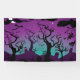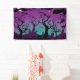 Bandeau d'Halloween noir, violet, turquoise, avec un cimetière avec des arbres éffrayants, tombes, croix, crânes, une sorcière, une chouette, des chauves-souris, un fantôme, un chat noir, des nuages et le croissant de lune sur l'arrière - plan pourpre et turquoise.